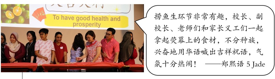 最让我难忘的是捞鱼生环节。校长、学校管理团队和家长义工领袖一同参与,我们大声念出吉祥贺语,在欢笑中学习华文词语背后的美好寓意,也感受到不同文化之间的尊重与连结。那一刻,我深深体会到,原来节日不仅是庆祝,更是一种传承与陪伴。