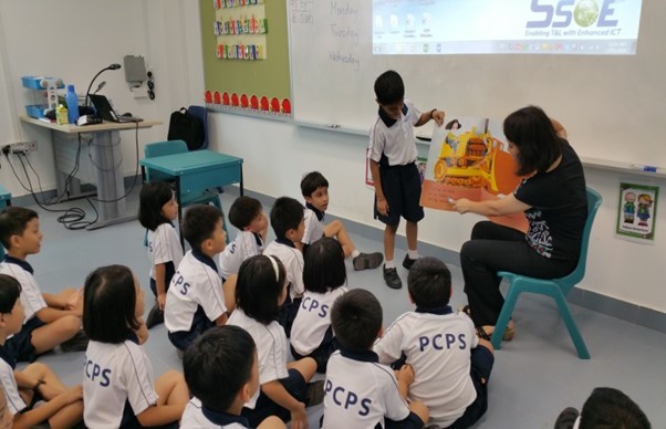 The teacher introduces and shares a Big Book with the pupils. Students are then taught language items, structures and skills explicitly, including concepts of print, phonics and grammar.