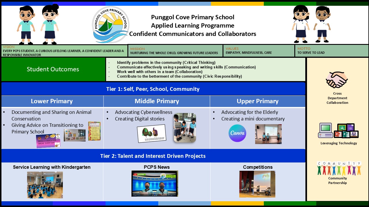 At Punggol Cove Primary School, we envision every student to be a Curious Lifelong Learner, a Confident Leader and a Responsible Innovator, ready to serve and lead. The Applied Learning Programme (ALP)- C^3- Confident Communicators and Collaborators- empowers students to apply their learning from English and New Media & ICT classrooms in meaningful service to the school and wider community.